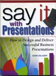 The Sources HotLinkGene Zelazny#s Say it With Presentations takes a hands-on approach to teaching effective presentation techniques. Loaded with graphics and learn by doing exercises, the program outlined in this book will leave you, if not a suave emcee, at least able to give a presentation that communicates your message and doesn#t bore your audience into submission. A particular strength of Say it With Presentations is material Gene presents on avoiding the biggest problems with presentations, both in content and form.